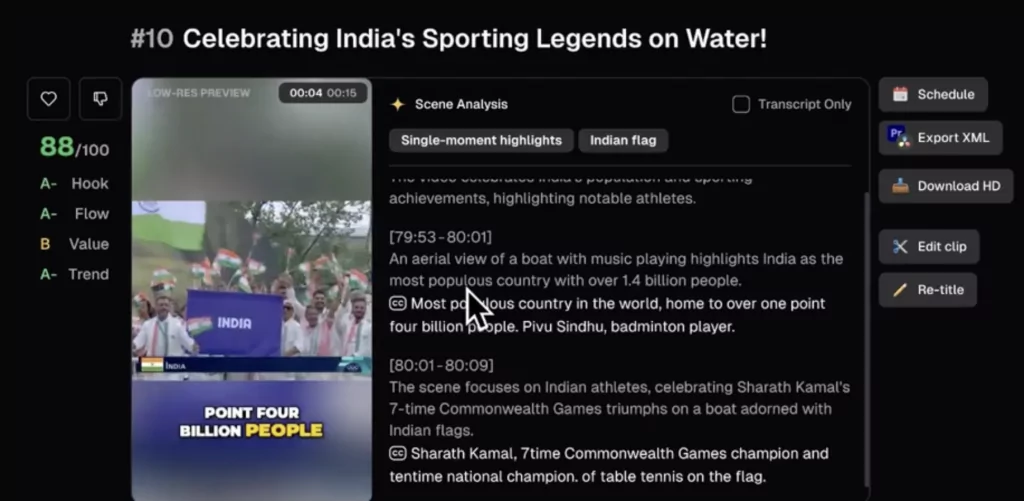 L’IA peut devenir un sérieux allié sur ce sujet. Comment récupérer par exemple vos contenus vidéos pour en faire x séquences pour vos réseaux sociaux ? On appelle cela du clipping et c’est ce que propose l’outil Opus Clip. Voir la démo chez Ruben Hassid qui a demandé à l’outil de visionner les 4h de la cérémonie des JO pour en extraire un homme en bleu et les séquences avec un drapeau Indien.