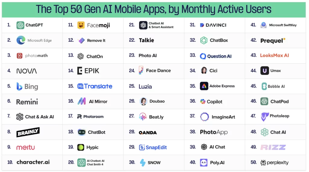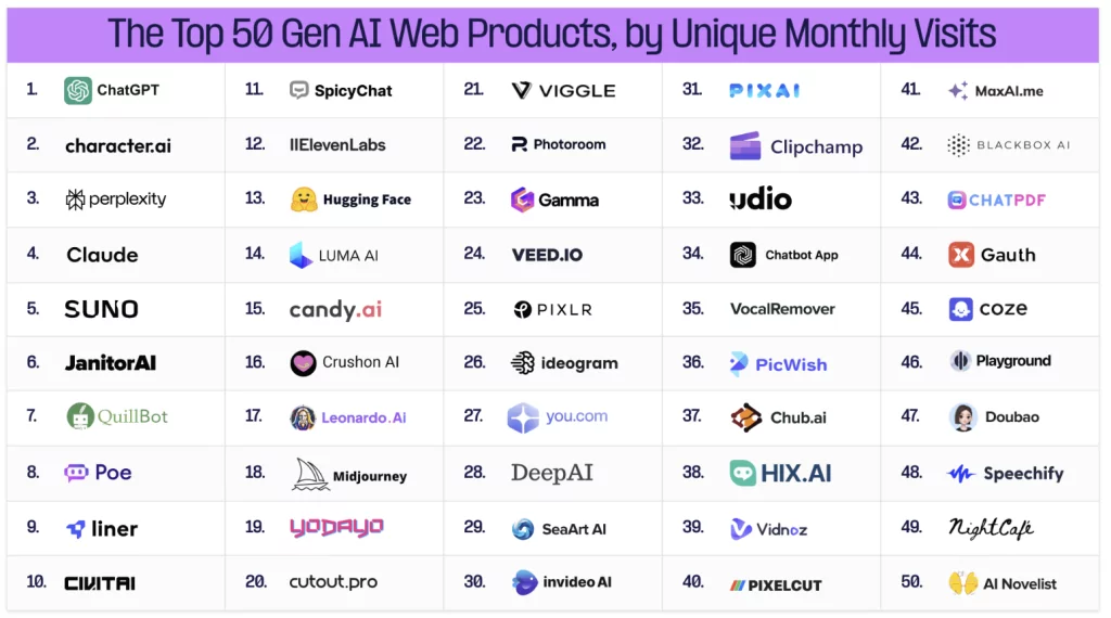 En termes d’usages existants aujourd’hui, Andreessen Horowitz, notamment investisseur chez Mistral AI, dévoile son rapport sur les meilleures apps IA grand public : créativité (voir plus bas), dating, esthétique, assistants… (Vu chez Nicolas Guyon) : 30 % de nouveaux dans le top 100 en 6 mois !