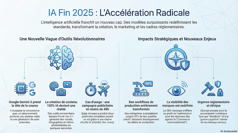 Avec Gemini 3 et le modèle de génération d’images Nano Banana Pro, Google impose ses règles et sa technologie à un rythme effréné, en l’intégrant directement au cœur de son écosystème qui touche des milliards d’utilisateurs.