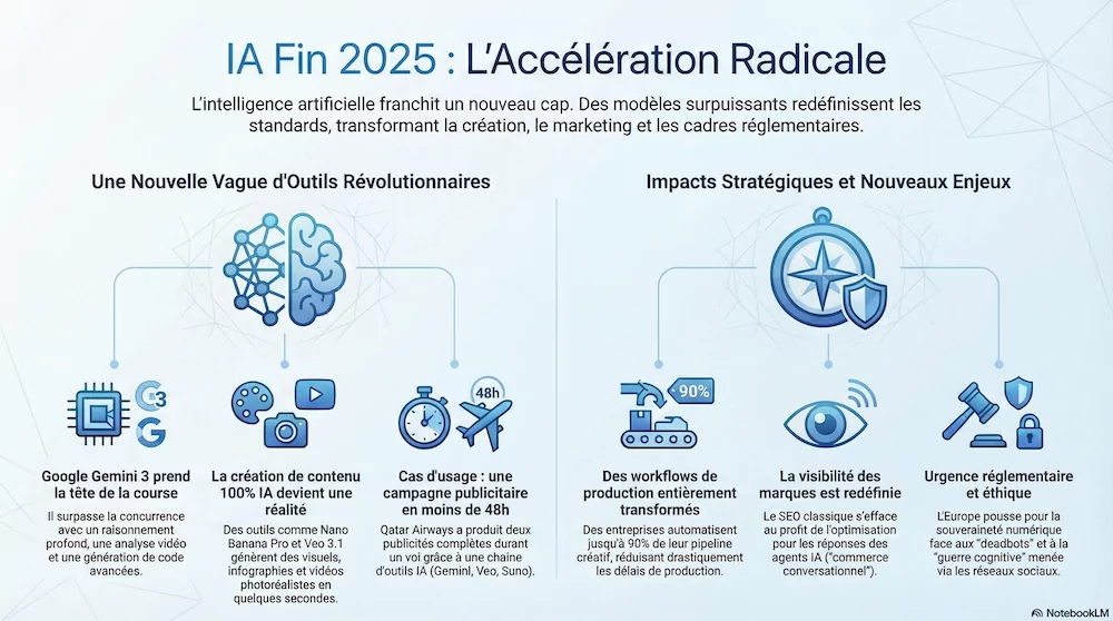 • Génération d’images : Les prompts ont été créés dans Gemini, utilisant probablement Nano Banana pour générer les visuels clés.